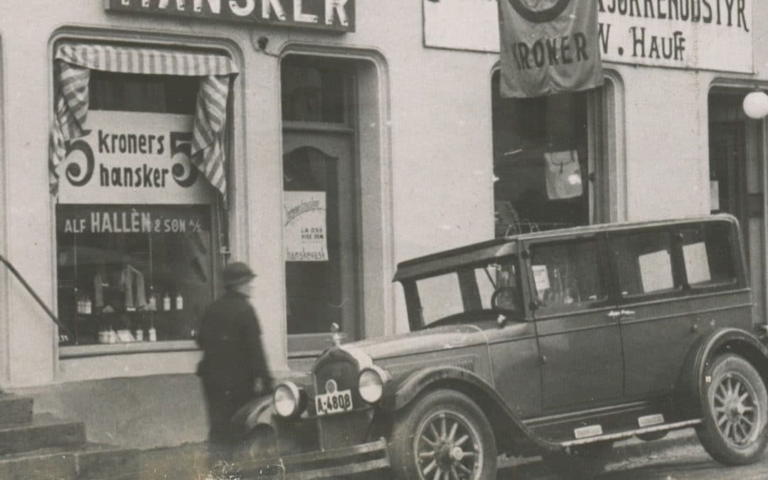 Bilde av en gammel Hanske-Hallén-butikk på Strømsø Torg i Drammen – Den gang hanskene kostet 5 kroner!